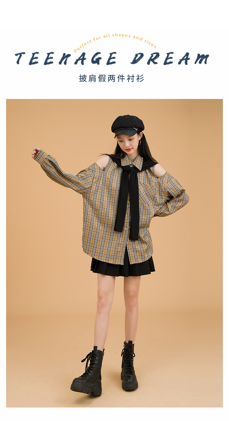 2021女装秋季格纹衬衫配纯色披肩两件套网红款港风显瘦女衬衫