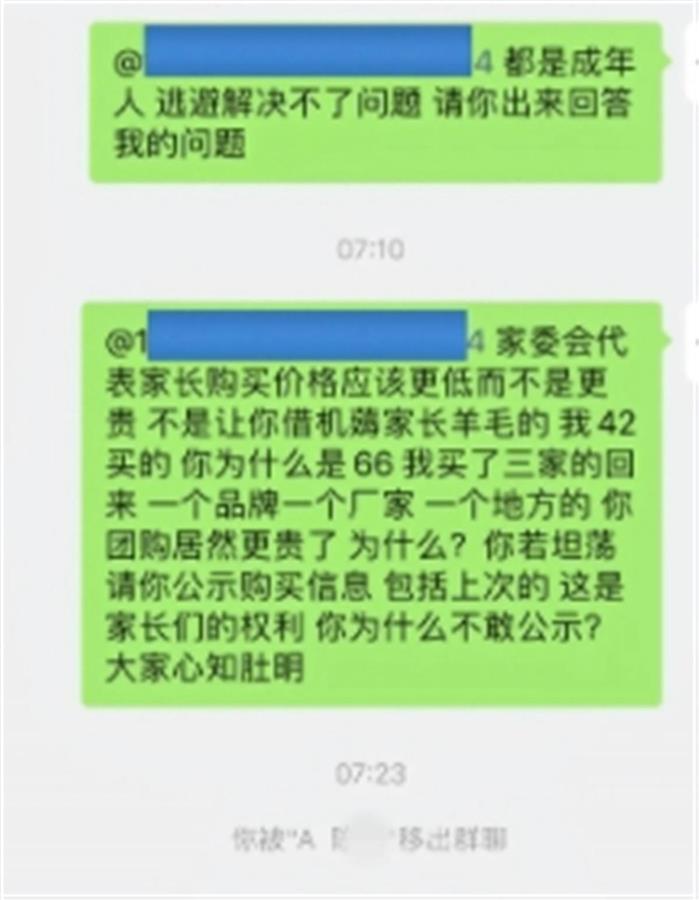 据该网友发布的多段视频显示,其女儿所在班级家委会要求家长统一购买一款演出服,该网友和家委会一名负责此事的家长沟通后决定自己购买,但对方后来给她发的链接衣服价格偏高,她因此在班级群里质问这名家长,但对方没有回复。班主任老师则在群里要求她遵守群纪律,并要和她私聊,该网友坚持在群里公开问,后被踢出群聊。