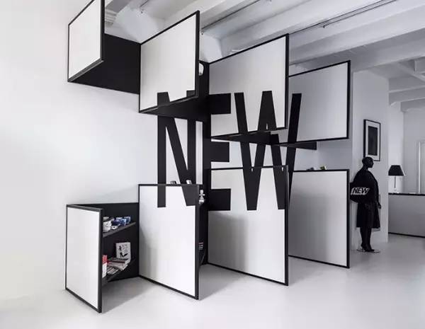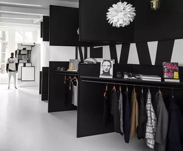 这是一个激进的设计,将两种商店以一种艺术的方式组合在一起。白色的矩形,黑色的对角,好像白色的博物馆和黑色的商店折叠在了一个奇特的空间。