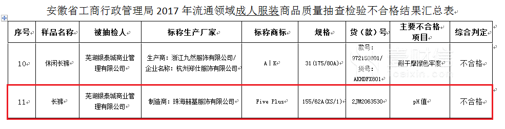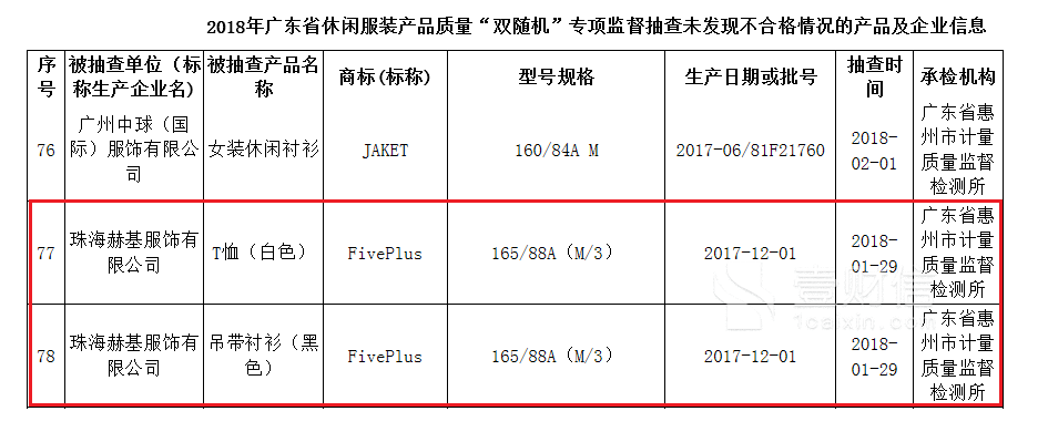 2018年6月11日,广东省质量技术监督局发布的《2018年广东省休闲服装产品质量“双随机”专项监督抽查结果公告》中显示, “Fiveplus”出现不合格产品。