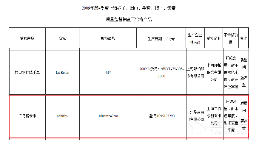 2010年3月15日,上海市质量技术监督局曾公布一批质量监督抽查不合格产品名单,其中赫基股份的关联企业生产的Ochirly品牌千鸟格长巾纤维含量、耐水色牢度、耐汗渍色牢度等质量问题严重。