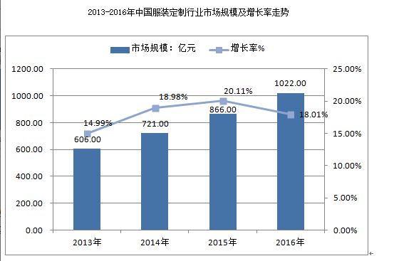 2016年,中国服装定制市场规模达到1022亿,同比增长18.01%。预计2020年服装定制市场将达到2000亿。