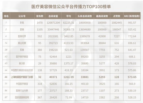 近日,在全新发布的《医疗美容行业新媒体信息传播研究报告》中,针对近千个医疗美容类微信公众号进行研究,监测2019年下半年的医美行业微信公众号的运营表现,推出《医疗美容微信公众平台传播力TOP100榜单》。