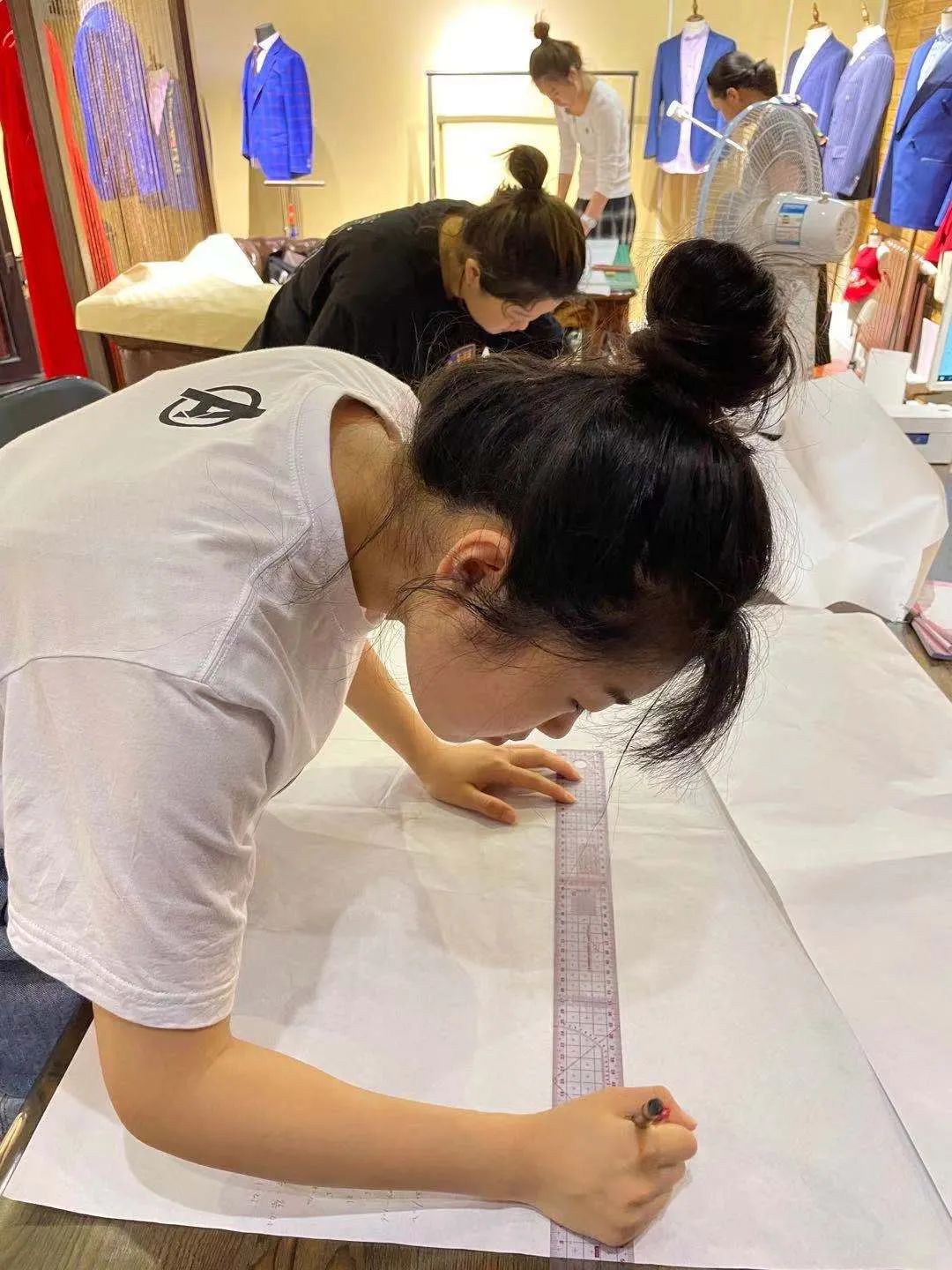 讲台中间的这位男士就是王可老师,即使是开服装定制店,店里也总少不了来学艺的人。