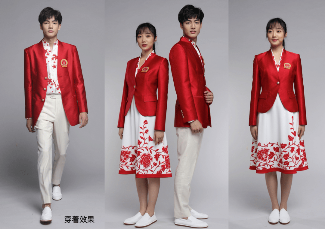 中国体育代表团共计777人身穿由北京服装学院贺阳、杨慧设计团队以“开门红”为主题设计的系列礼仪服装精彩亮相。北京服装学院继2008年为北京奥运会、残奥会设计制服、火炬接力制服和残奥会运动员入场式制服之后,先后在多个重大国际体育赛事中承担服装设计任务,以服装的形式设计国家形象。