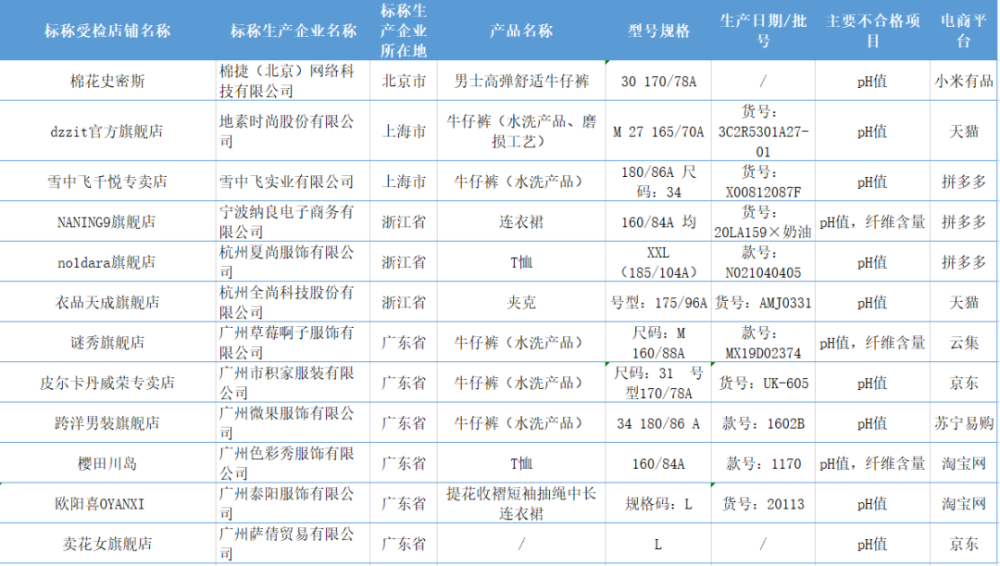 据悉,此次共抽查了14个省(市)301家企业生产的315批次休闲服装产品,其中25批次产品涉嫌假冒、无厂名厂址。检验的290批次产品中,有43批次产品不合格,不合格发现率为14.8%。重点对甲醛含量、pH值、可分解致癌芳香胺染料、耐水色牢度、耐酸汗渍色牢度、耐碱汗渍色牢度、耐干摩擦色牢度、纤维含量等8个项目进行了检验。不合格项目涉及纤维含量、pH值、耐水色牢度、耐碱汗渍色牢度。
