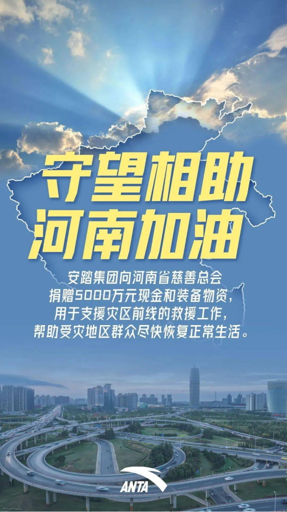 7月21日,安踏集团决定向河南省慈善总会捐赠总计5000万元的现金及装备物资,用于支援灾区前线的救援工作,帮助受灾地区群众尽快恢复正常生活。