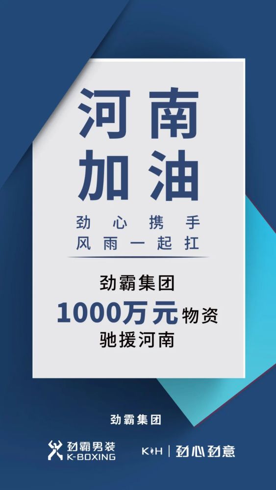 劲霸集团通过中国青少年发展基金会,紧急捐赠1000万元物资,包括劲霸男装服装、劲霸男装全资大健康品牌“劲心劲意”的口罩及防疫包等防疫、健康防护物资,驰援河南。作为以“家国事业楷模”为愿景,历经41年发展的中国商务休闲男装领导品牌,劲霸男装希望能够尽力所能及的绵薄之力,帮助受灾地区群众尽快恢复正常生活,并向所有奋战在一线的救援人员及组织机构致以祟高的敬意!