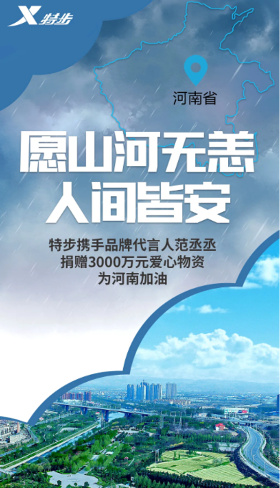 特步携手品牌代言人范丞丞,通过中国扶贫基金会定向河南,向“河南暴雨紧急救援”项目捐赠价值3000万元人民币鞋服装备,保障灾区人民基础生活用品需求。特步表示,大雨终会停,全国人民共同守望阳光再次照亮中原土地,河南加油!
