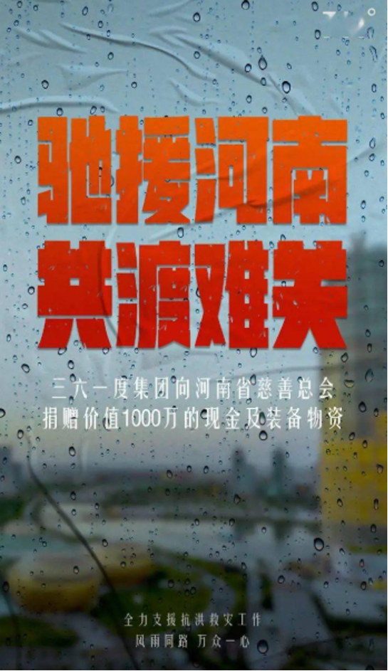 三六一度集团向河南省慈善总会捐赠价值1000万元现金及物资,全力帮助抗洪救灾及灾后重建工作,并向全体奋战在抗洪前线的救援人员及机构致以最祟高的敬意! 三六一度集团表示,驰援河南,共度难关。风雨同路,万众一心。郑州加油,河南加油!