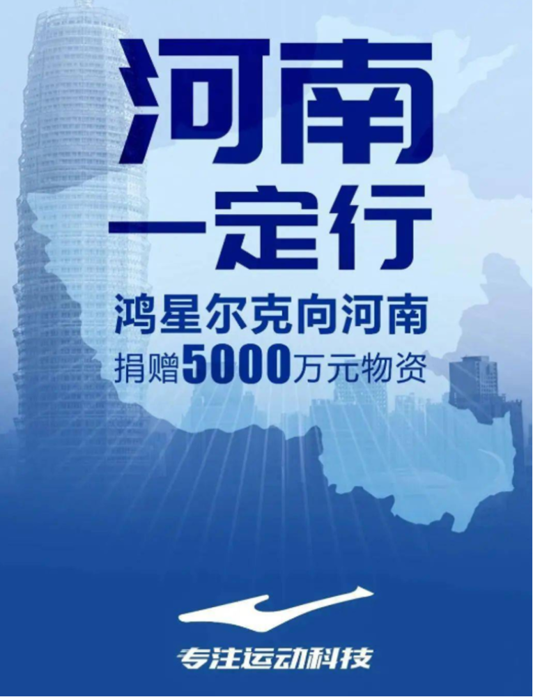 鸿星尔克心系灾区人民,紧急成立救灾指挥小组,决定捐赠5000万元救灾物资,通过郑州慈善总会、壹基金紧急驰援灾区,以实际行动为工作在抗洪一线的救援人员、社区工作者及受灾群众带去有力支持。守望相助,同舟共济,众志成城,万众一心。作为民族品牌的一员,鸿星尔克始终关注公益事业,心系社会,第一时间为灾区送去急需的物资。鸿星尔克表示后续将持续关注河南灾情,为灾区人民提供力所能及的帮助。