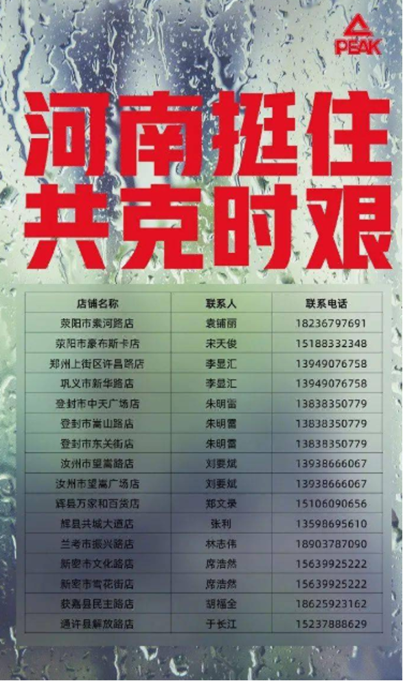 匹克则由集团CEO许志华通过其个人微博宣布,河南省内受灾地区的匹克店铺立刻投入到抗洪救灾工作中,对有需求的困难群众提供避难场所,匹克还在店铺里准备了食品、饮用水、干净的鞋子和衣服,全部免费。