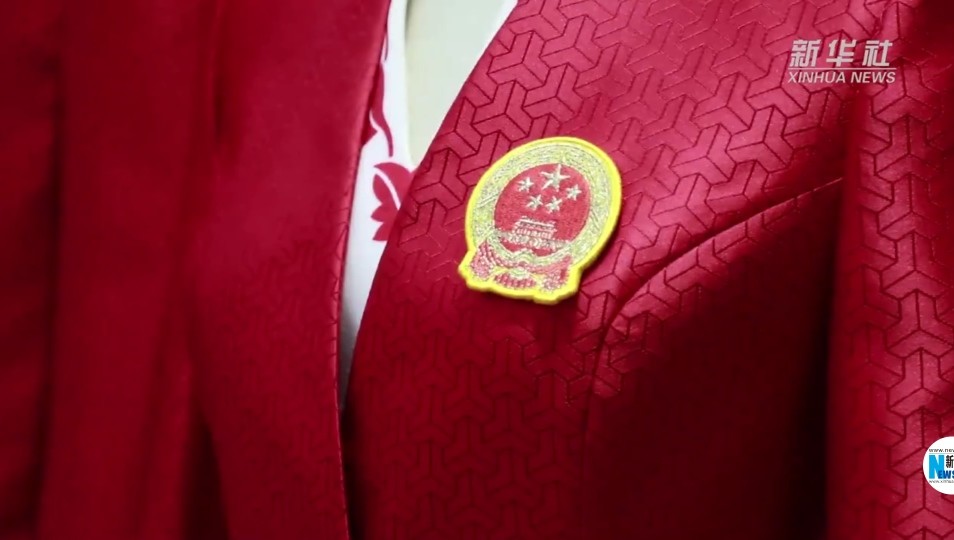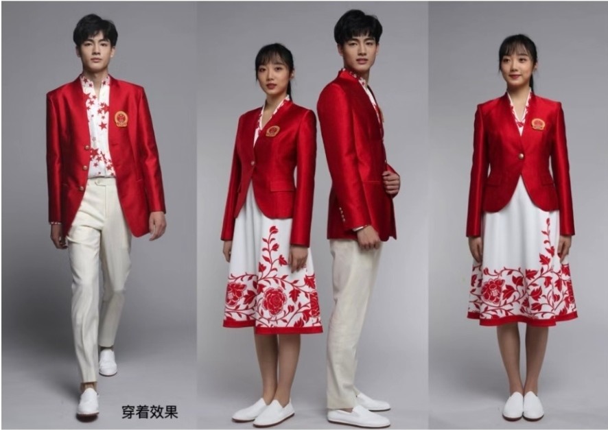 女性服装中还运用了雍容华贵的牡丹花元素;男性服装中则是以五角星为图案核心,国旗与国花相结合,突出运动员们的刚劲与秀美。