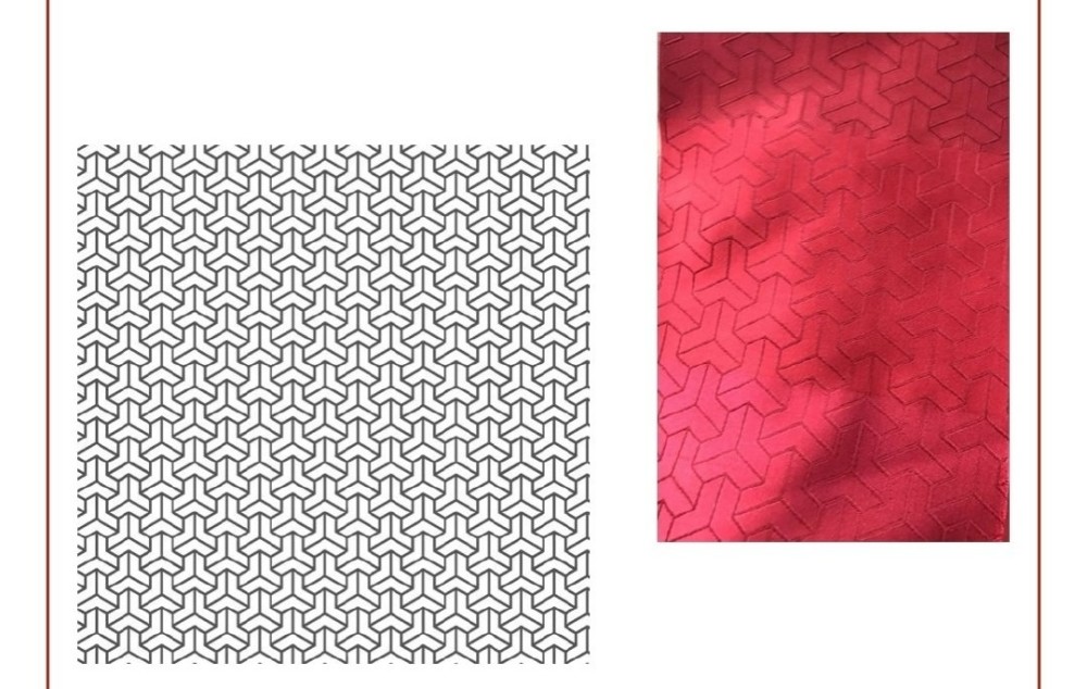 那就是外衣面料采用锁甲纹提花织造,使红色上衣更有质感,锁甲环环相扣,具有坚不可破的寓意,象征出征的战士!