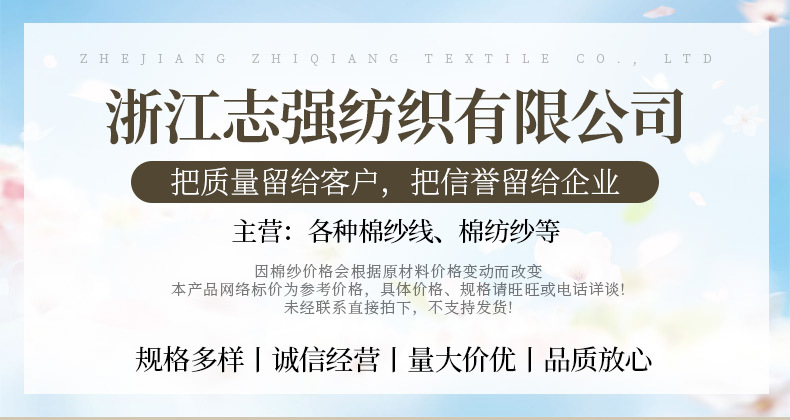 本网页所展示的有关【厂家再生气流纺棉纱线本白色奶白涤棉7支10支21支漂白棉纱线批发_毛纱_浙江志强纺织有限公司】的信息/图片/参数等由服天下的会员【浙江志强纺织有限公司】提供,由服天下会员【浙江志强纺织有限公司】自行对信息/图片/参数等的真实性、准确性和合法性负责,本平台(本网站)仅提供展示服务,请谨慎交易,因交易而产生的法律关系及法律纠纷由您自行协商解决,本平台(本网站)对此不承担任何责任。您在本网页可以浏览【厂家再生气流纺棉纱线本白色奶白涤棉7支10支21支漂白棉纱线批发_毛纱_浙江志强纺织有限公司】有关的信息/图片/价格等及提供【厂家再生气流纺棉纱线本白色奶白涤棉7支10支21支漂白棉纱线批发_毛纱_浙江志强纺织有限公司】的商家公司简介、联系方式等信息。